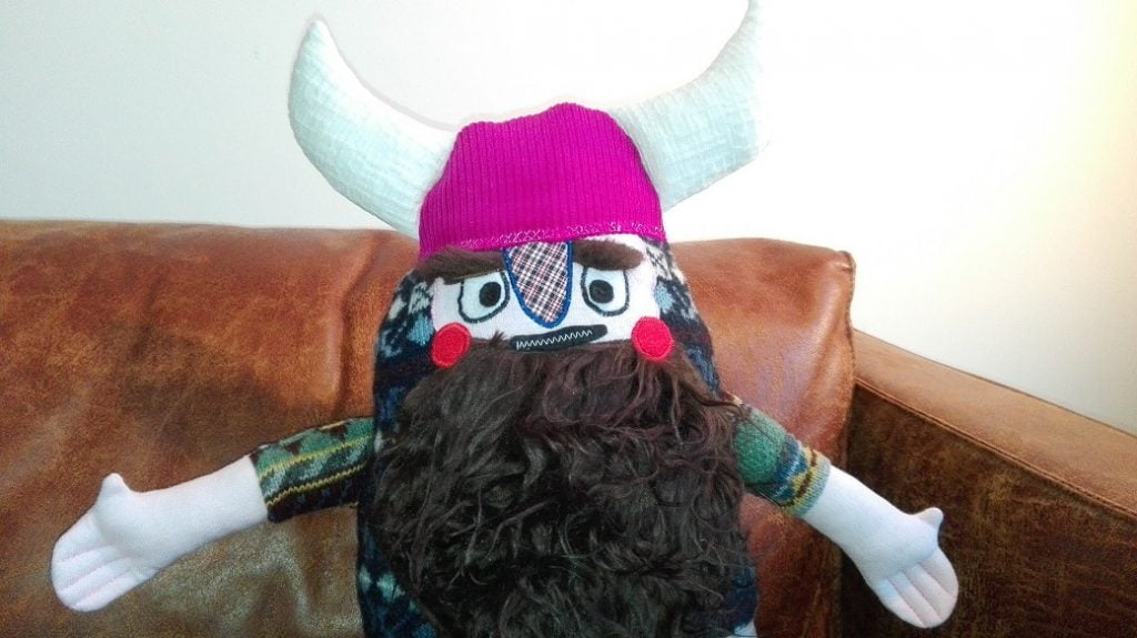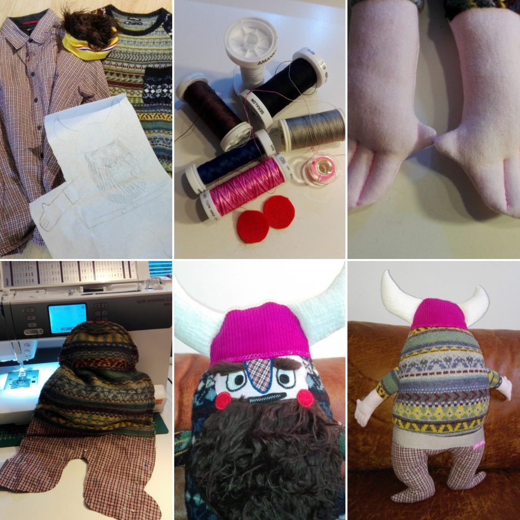 Dit project begon met een versleten trui van manlief, waar de schaar in mocht. Ook had ik nog een oude ruitjes-bloes liggen en zo’n Sven-Kramer-mutsje (wat je ooit bij een bepaalde supermarkt kreeg). Ik maakte een schetsje, zocht wat passend garen bij elkaar en begon toen gewoon te knippen en te naaien. En toen was het ‘ineens’ een lieve, stoere Viking die nu altijd gezellig bij ons op de bank zit.